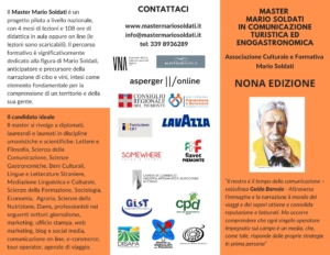 Il master è significativamente dedicato alla figura di Mario Soldati, anticipatore e precursore della narrazione di cibo e vini, intesi come elemento fondamentale per la comprensione di un territorio e della sua gente. Le ore di lezione saranno 114, oltre a 12 extracurriculari, Alla conclusione del master verrà rilasciato un attestato di merito e di frequenza esclusivamente agli allievi che avranno seguito almeno 90 ore delle 114 di lezione in programma e che avranno partecipato al progetto della tesi collettiva. I docenti saranno 16, selezionati tra professionisti di provata eccellenza nei diversi ambiti richiesti: turismo, enogastronomia, comunicazione, social media, enologia, alimentazione, marketing, ufficio stampa, fotografia, tecniche e linguaggi della scrittura, televisione, Artificial Intelligence e new media, editoria e guide, comunicazione integrata, comunicazione inclusiva.